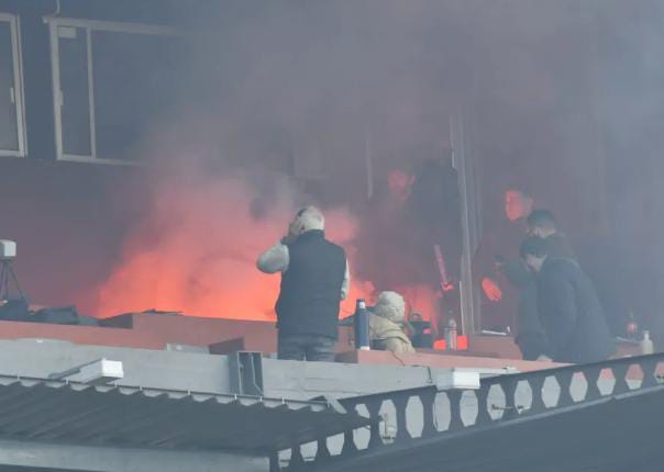 Una cámara registró y trasmitió en vivo el momento en el que fue lanzada la bengala marina desde la hinchada de Nacional que hirió de gravedad a un policía que se ubicaba en la bancada de prensa de la Tribuna América.