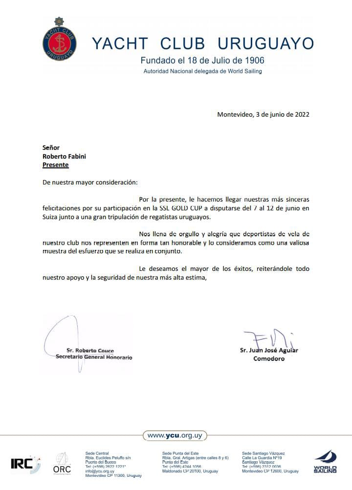 LE LLEGÓ UNA MISIVA A SUIZA PARA ROBERTO FABINI DEL YACHT CLUB URUGUAY DÓNDE EL ES SOCIO…