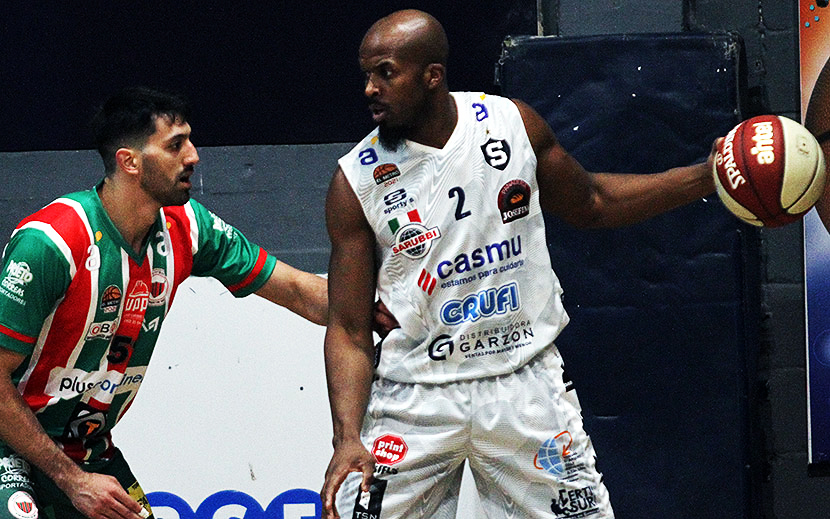 Ricardo Glenn (Larre Borges) maniobra con la pelota ante la marca del argentino Ignacio Alessio (Tabaré