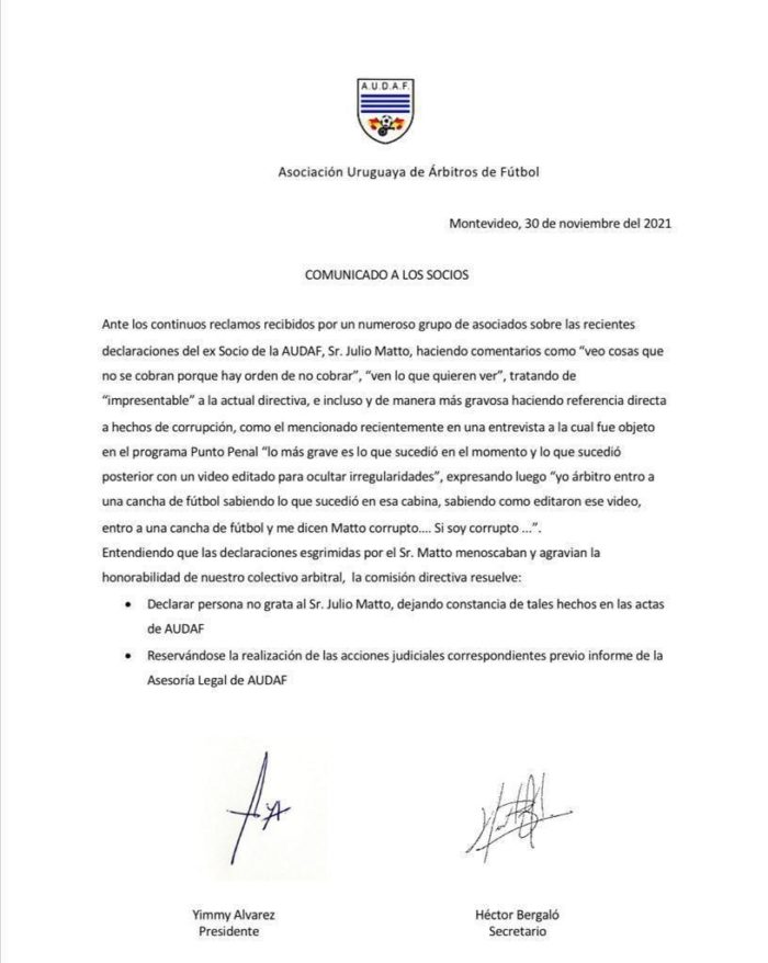 EL EX ARBITRO JULIO MATTO EXPULSADO Y LO DECLARARON PERSONA NO GRATA